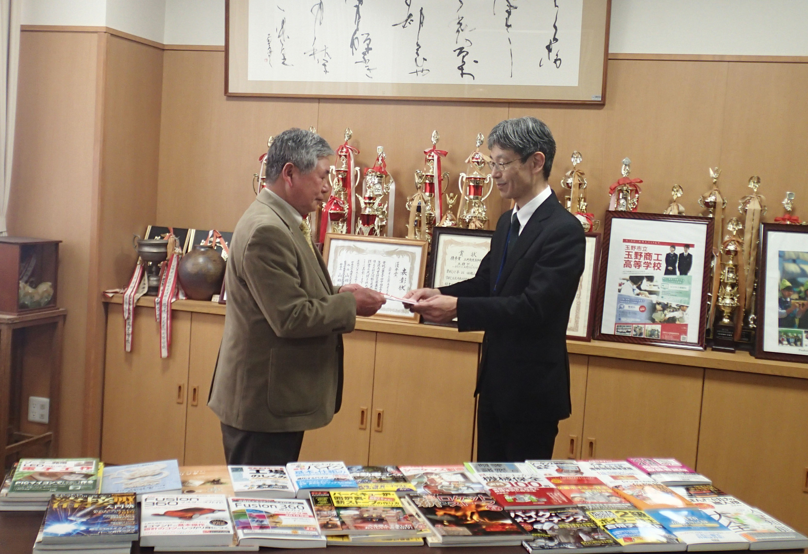 (写真)玉野市立玉野商工高等学校田村校長(右)へ目録を贈呈する柏谷総務委員長(左)
